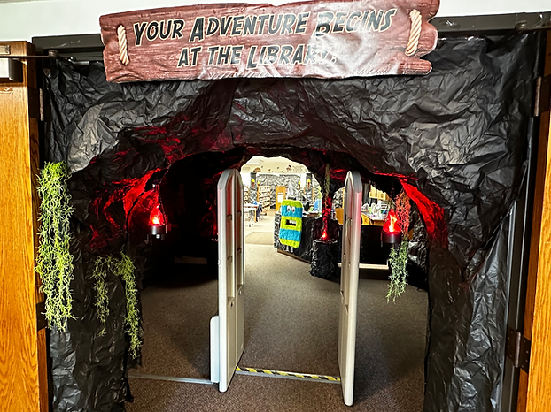We first set up the arches at either end of the cave area. We needed a third smaller arch, so we taped two pool noodles together to make a small one that led to our circulation desk. That was the only framework. Using long pieces (about 5ft long) of bulletin board paper, we first scrunched and crumpled it up, then carefully re-opened it and stapled/taped/glued it to form the rock walls, floor to ceiling, curving and wrapping around the frames as needed. It doesn’t need to look perfect! We used double-sided or rolled tape to close seams. There is a display case in our entry where we put all of the prizes that kids can win. We covered it similarly but cut peep-holes so they could discover them! Inside the display case are also spider webs, gems, and gold coins to give it a treasure effect.